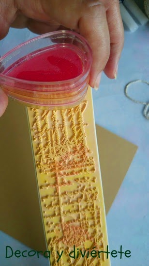 Por si no habéis utilizado nunca un sello os explico como se hace , una vez untado el sello con la tinta tenéis que poner el sello sobre la superficie a estampar y sin mover el sello apretáis un poco para pasar el dibujo del sello a la cartulina como en este caso .