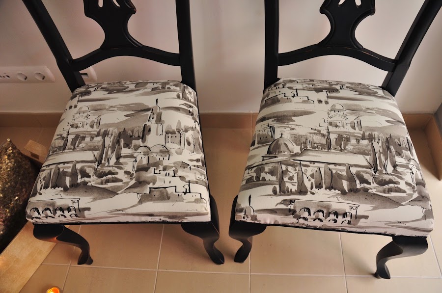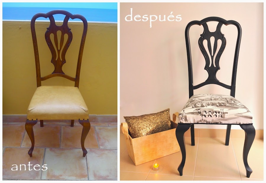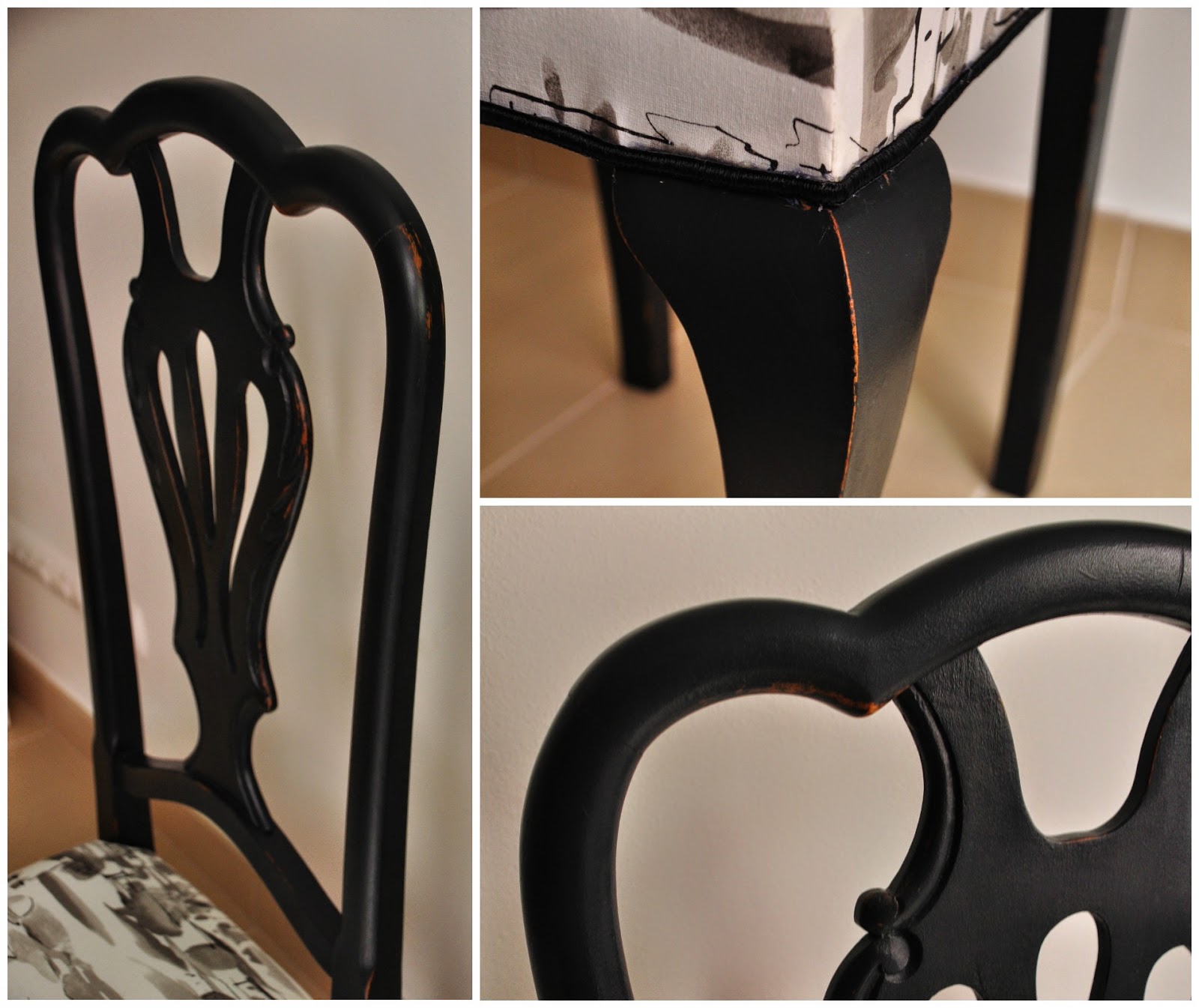 Holaaa!! Que ganas tenía de enseñarles a Pili y Mili!! Dos sillas gemelas, conseguidas en un rastro, que por fin he terminado de transformar! Me gustó su silueta (buscando un poco creo que de estilo "reina Ana") y enseguida, no sé la causa, me vino a la cabeza el color negro!. Aproveché para utilizar, las ya mencionadas en este blog, pinturas chalk paint auténtico (por fin esta pintura en mis manos!), miré la paleta de colores y el "casi negro" me venía perfecto!
