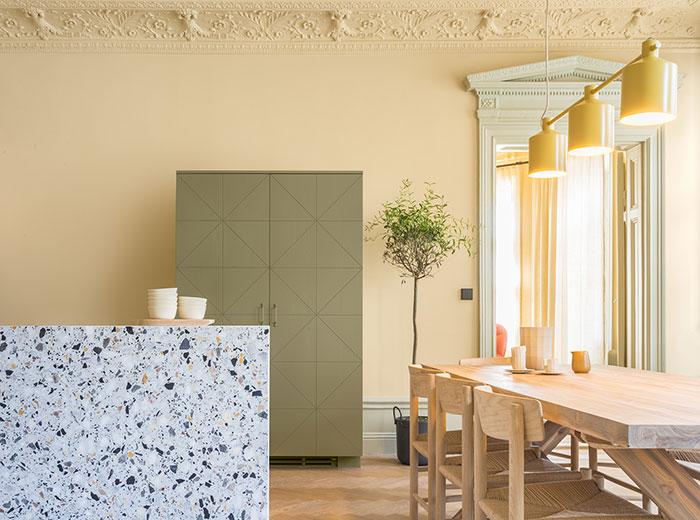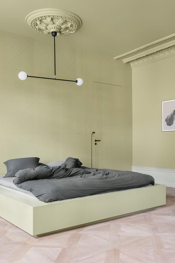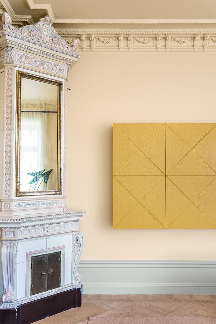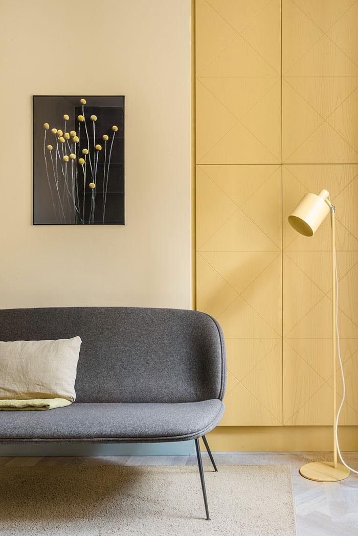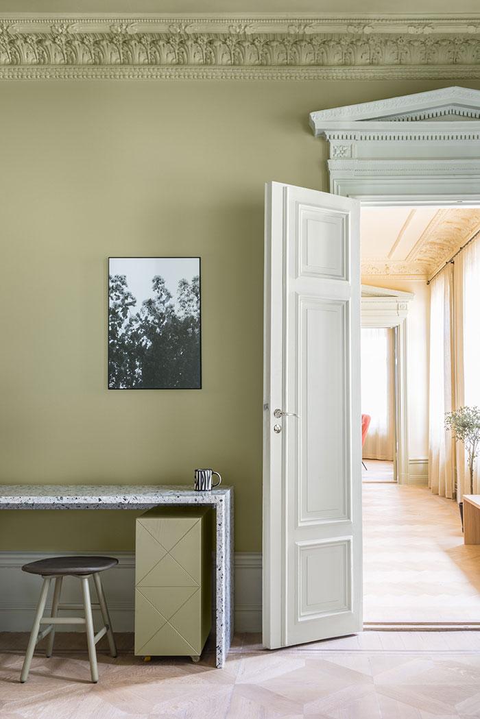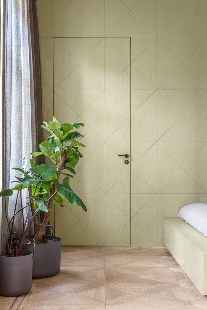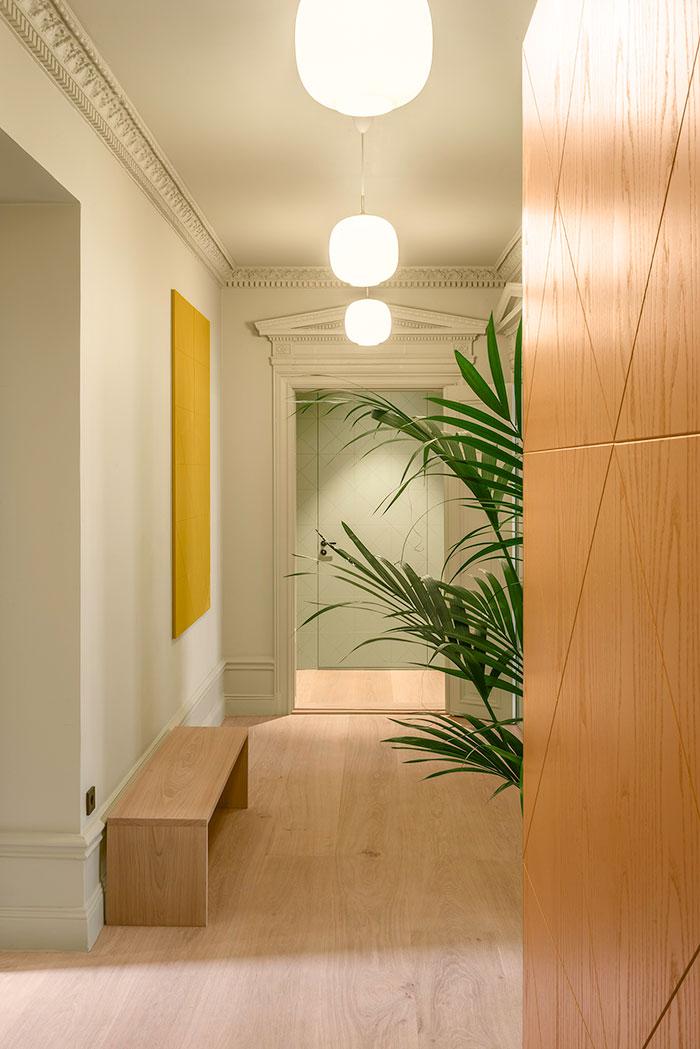 Se han respetado al máximo los elementos ornamentales de edificio (molduras, chimeneas,..) integrándolos en la nueva decoración a través de un uso inteligente del color. Para la realización del nuevo mobiliario, se han utilizado paneles de madera con motivos geométricos que en su mayoría se encuentran volados para dar sensación de ligereza.