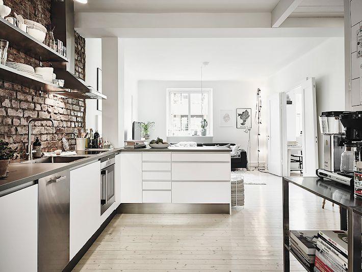 El suelo en todo el apartamento es de listones de una madera en color pino. Y en la cocina la protagonista es la pared de ladrillo que se integra a la perfección con el resto de mobiliario más moderno y que junto con algunos utensilios y la presencia de mobiliario en acero inoxidable dan el toque industrial.