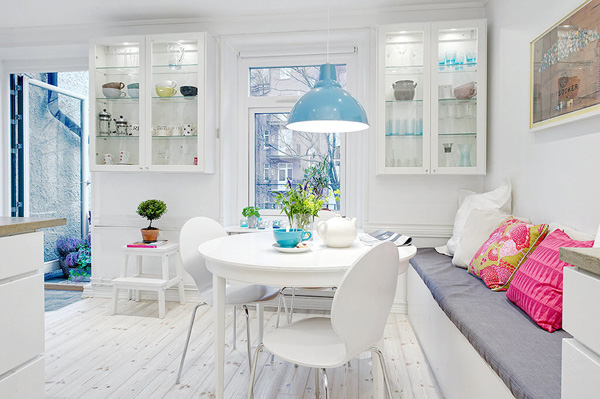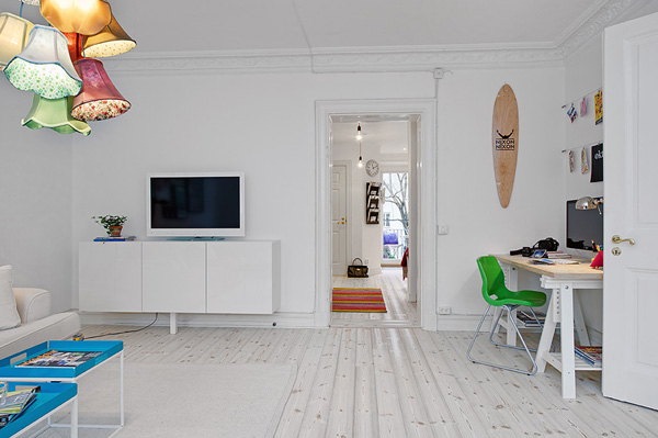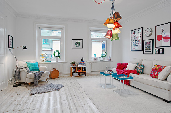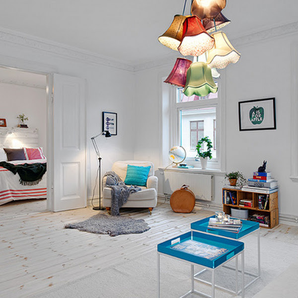 Ya sabéis lo que me gusta el estilo escandinavo y el color blanco tan propio de él. El apartamento que hoy os traigo se encuentra en la ciudad sueca de Vasastan, en sus 70 m2 de superficie se ha aprovechado la base blanca de su precioso suelo de madera teñido, sus paredes de este mismo color y la luz que entra por sus grandes ventanas para conseguir estancias luminosas y espaciosas, pero han dado un toque muy alegre y divertido al interiorismo gracias a los numerosos toques color introducidos en los textiles y en las originales lámparas protagonistas del salón y la cocina, ME ENCANTA!!