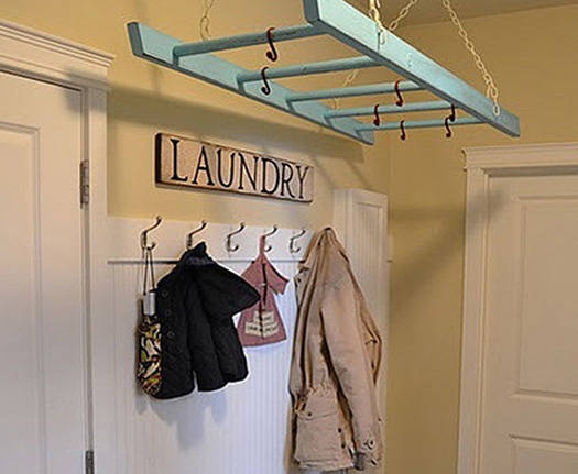 Pero si no os convence la idea de colgar las escaleras por las paredes o techos siempre os queda la opción de apoyarlas en la pared y dejar hay la ropa del día , como si fuera un galán , siempre es una muy buena solución.