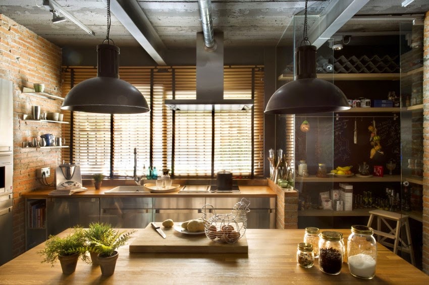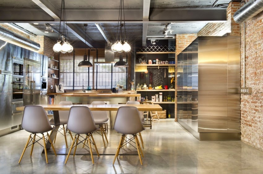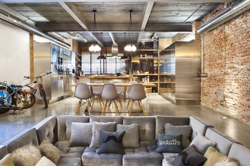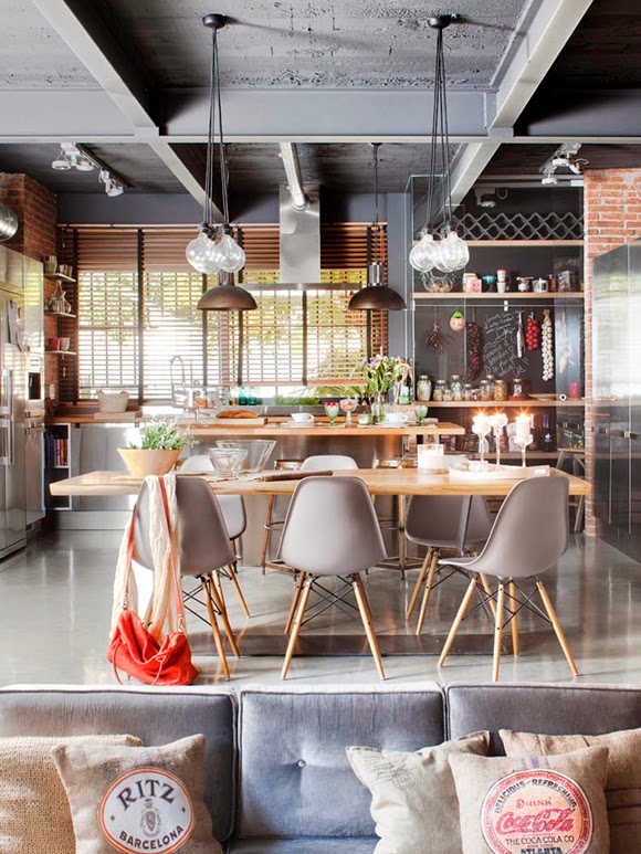 La zona social se encuentra dividida en dos alturas. El salón lo encontramos excavado en los cimientos de la vivienda; y separado por unos centimetros, en la parte posterior la zona destinada al comedor y la cocina. A todo el espacio se le ha conferido un bonito ambiente industrial, gracias al uso de la gama de los grises en los muebles y textiles; así como de las vigas metálicas vista.