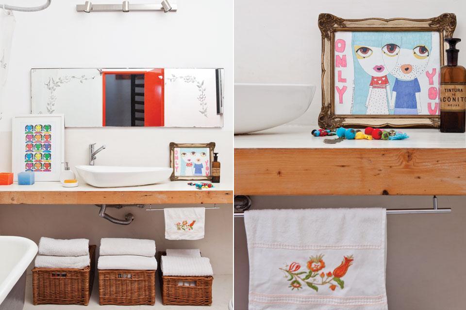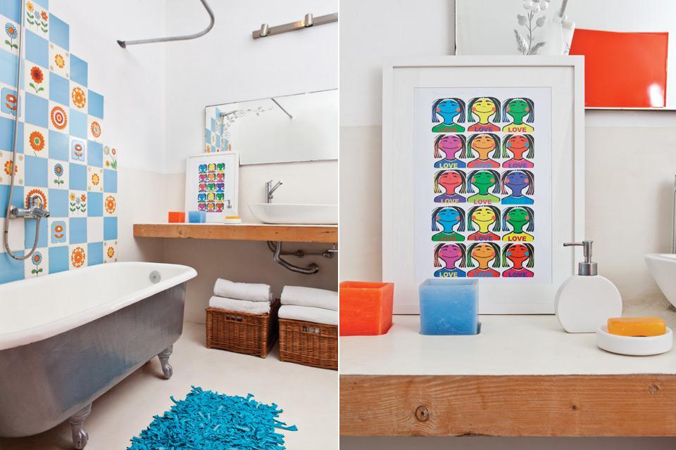 Un baño de 4’20 metros cuadrados en los que la imaginación tiene cabida y sobretodo la personalidad. Con el blanco y la madera como colores base, el color se apodera de este baño donde los azulejos con flores de colores, cuadros coloristas y velas perfumadas dan personalidad a un precioso espacio donde la reina, una preciosa bañera tradicional en color plata con patas combina con los modernos apliques en acero y a su vez contrasta con un moderno lavabo forma irregular.