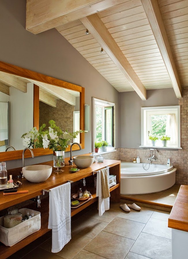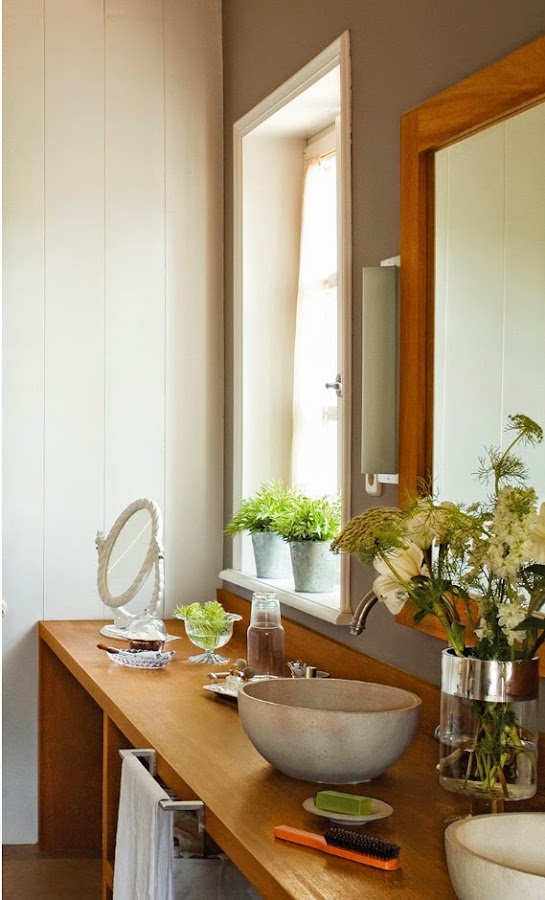 Tres baños con esencia rústica muy marcada y con inspiradores detalles de naturaleza vintage . El suave color melocotón pálido los envuelve en una atmósfera entrañable y acogedora. Tres fuentes de inspiración para ese lugar tan íntimo que puede cambiar totalmente añadiendo alguna pieza antigua, elementos de madera o de piedra, objetos de mimbre o de forja, pequeños detalles que caracterizan el est ...