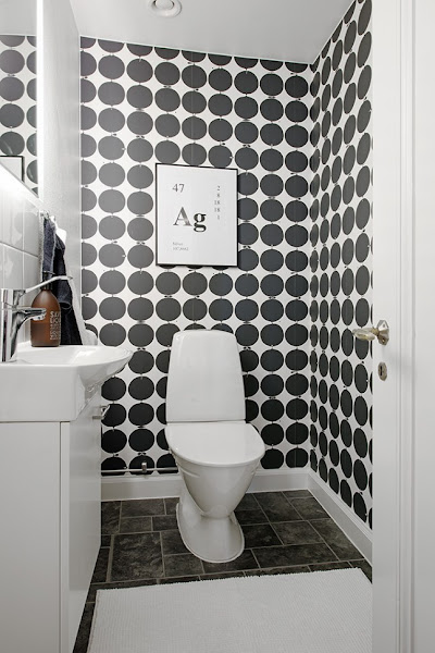 En el baño han seguido la misma línea que en la entrada, eligiendo un papel en blanco y negro con formas circulares.
