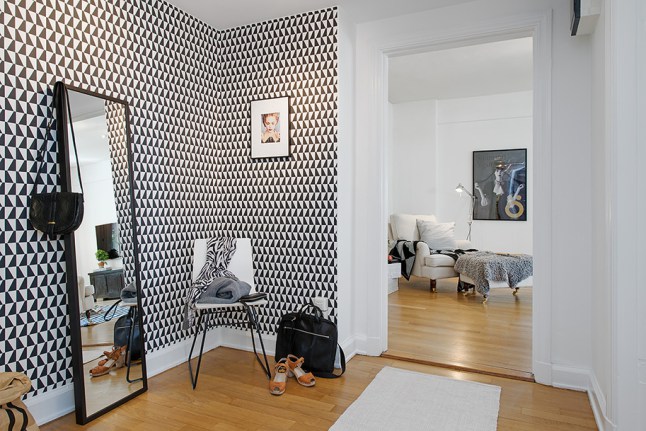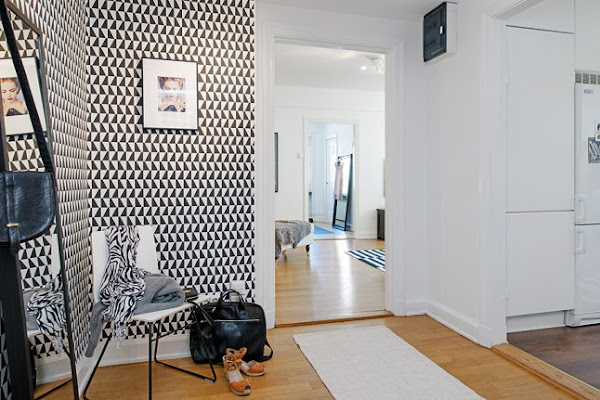 Apostar por un papel con tanta fuerza como este geométrico en blanco y negro, en este caso y a pesar de lo que pudiera parecer en un principio, en vez de empequeñecer la zona de entrada, le aporta personalidad y carácter haciendo que sea única y mucho más personal, diferenciándola del resto de la casa.