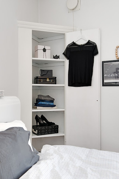 Me encanta la idea de aprovechar una esquina con un ángulo cerrado, convirtiéndola en un armario con una zona de almacenaje extra. Es perfecta para guardar papeles o como en este caso, como pequeño vestidor o zona de "tesoros".