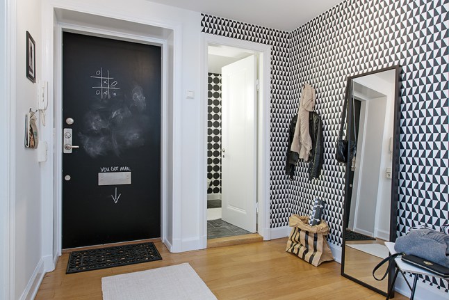 Pintando la puerta de la entrada con pintura de pizarra negra, conseguimos integrarla mejor en la decoración y la hacemos partícipe de ella. Además ganamos un espacio extra que podemos aprovechar para decorar con dibujos, notas o frases que nos inspiren para coger fuerza antes de salir cada mañana.