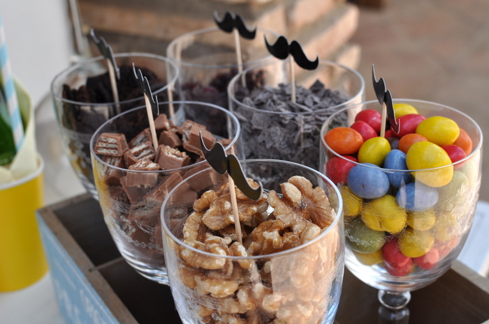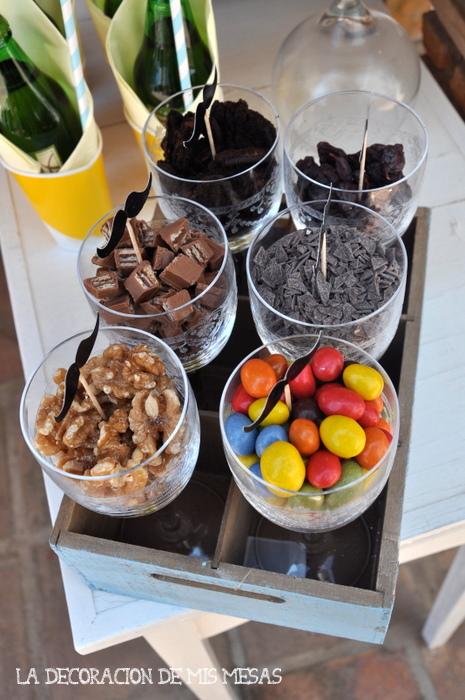 Para los toppings, deja correr a tu imaginación. ¡Cualquier cosa puede servir!. En mi caso, puse M&M, Kit-Kat, Oreo, Nueces, Pasas y virutas de chocolate, cada elemento dentro de una copa de cristal (puedes usar cualquier recipiente que tengas) y adornados con unos toppers de mustachos.
