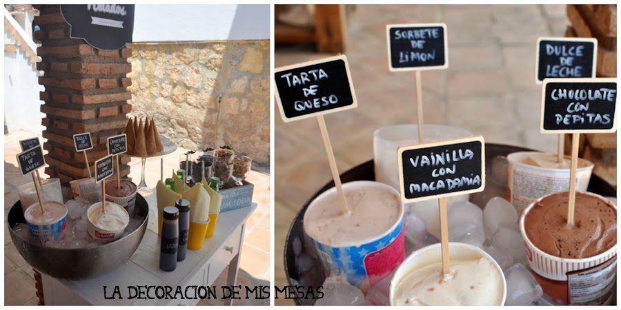 Como siempre, utilicé una pequeña mesa auxiliar para poner los elementos de este buffet de helados, dándole un cierto aire retro con un cartel en cartulina negra encima de la mesa.