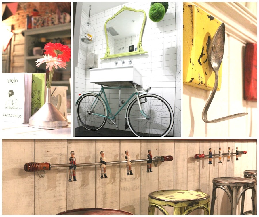 Nos encanta este tipo de decoración, nos encanta aprovechar el ingenio para utilizar objetos cotidianos y darles otros usos. En nuestro proceso de decoración no tuvimos la ayuda de ningún profesional en decoración. Internet, hoy por hoy es una herramienta súper eficaz para ver diseños y decoraciones que se ajustan a nuestro estilo. Muchas de las cosas que hemos utilizado en la decoración del local, las habíamos visto en diversas publicaciones, otras son de nuestra cosecha. La integración de todo en un espacio tan reducido como el que disponíamos ha sido un trabajo de chinos. Al final el local se nos quedaba pequeño para tantas cosas que queríamos hacer, aunque estamos muy satisfechos del resultado final.