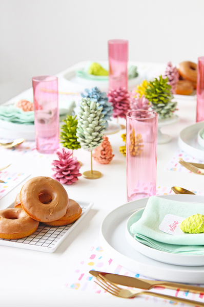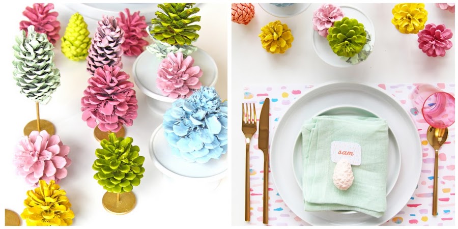 Usar piñas como decoración de mesa de Navidad ya es un clásico pero podemos darle un aire más moderno a nuestra mesa si las pintamos de colores.