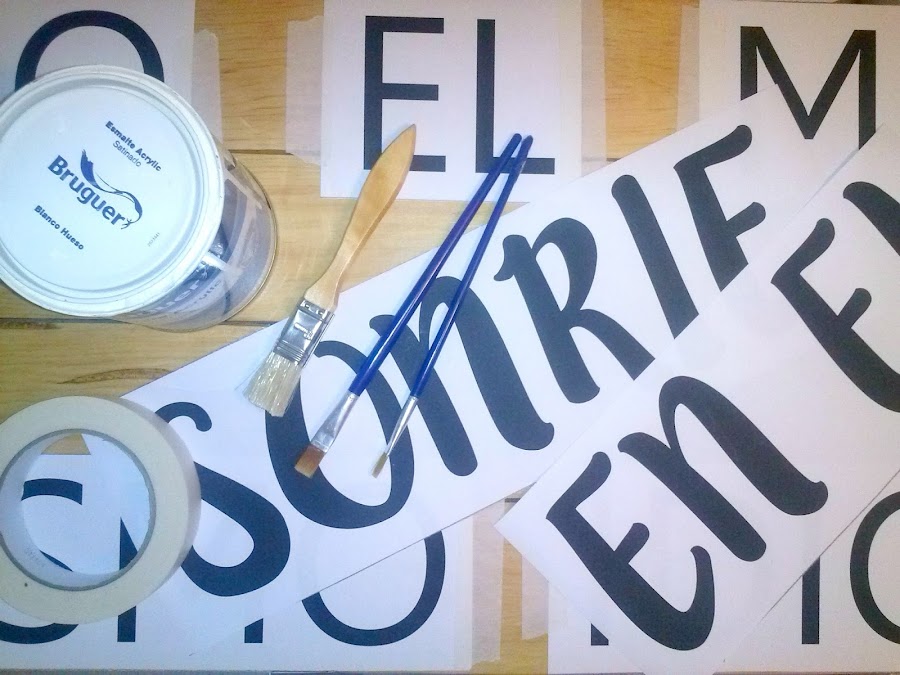 Una vez que estuvieron listas las tablas las uní entre si y deje que la cola blanca hiciera su trabajo dejándola secar 24 horas. Con el soporte listo, le llegó el turno a las letras. Para estas hice un pequeño diseño aquí en el ordenador y las imprimí al tamaño que vi correcto para que me sirvieran de guía a la hora de pintarlas. Y en eso me puse. Una a una fui pintando las letras de color blanco, y cuando terminé, deje secar y volví a darles una capa mas de pintura porque los a los colores claros siempre hay que darles al menos dos manos para conseguir un acabado bueno. Ya por ultimo, cuando todas las letras estuvieron secas, le di un par de capas de barniz incoloro y listo.
