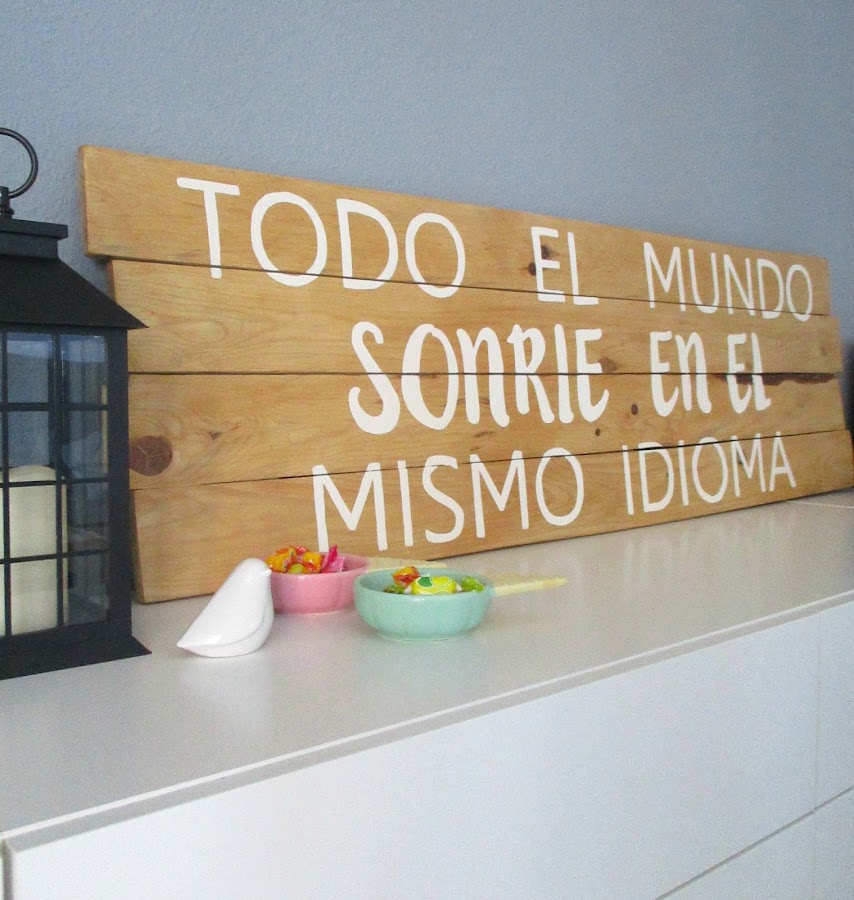 Carmen se puso en contacto conmigo porque tenia un piso que alquila a estudiantes de Erasmus que vienen a Málaga y quería darle un toque nuevo y original a la decoración del salón con un cartel, algo que fuera acorde a la característica principal de este piso, que se hablan muchos idiomas en el. Así que estuvimos viendo distintas frases que podrían encajar y finalmente escogimos esta: "Todo el mundo sonríe en el mismo idioma". La verdad es que es una frase muy chula que refleja lo que os hablaba antes de la característica principal del piso y que además ayuda a crear "buen rollito" entre los que viven allí. Ha sido una buena elección.