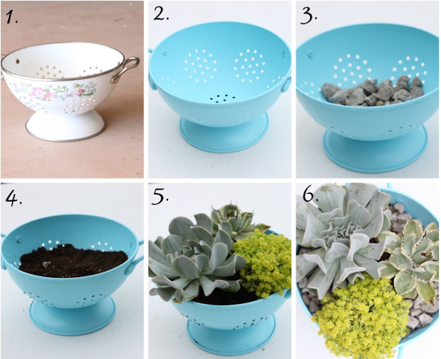 Para conseguir uno igual, pinta el colador con una o dos capas de pintura en spray y planta unas cuantas suculentas o cualquier otra planta que te guste.