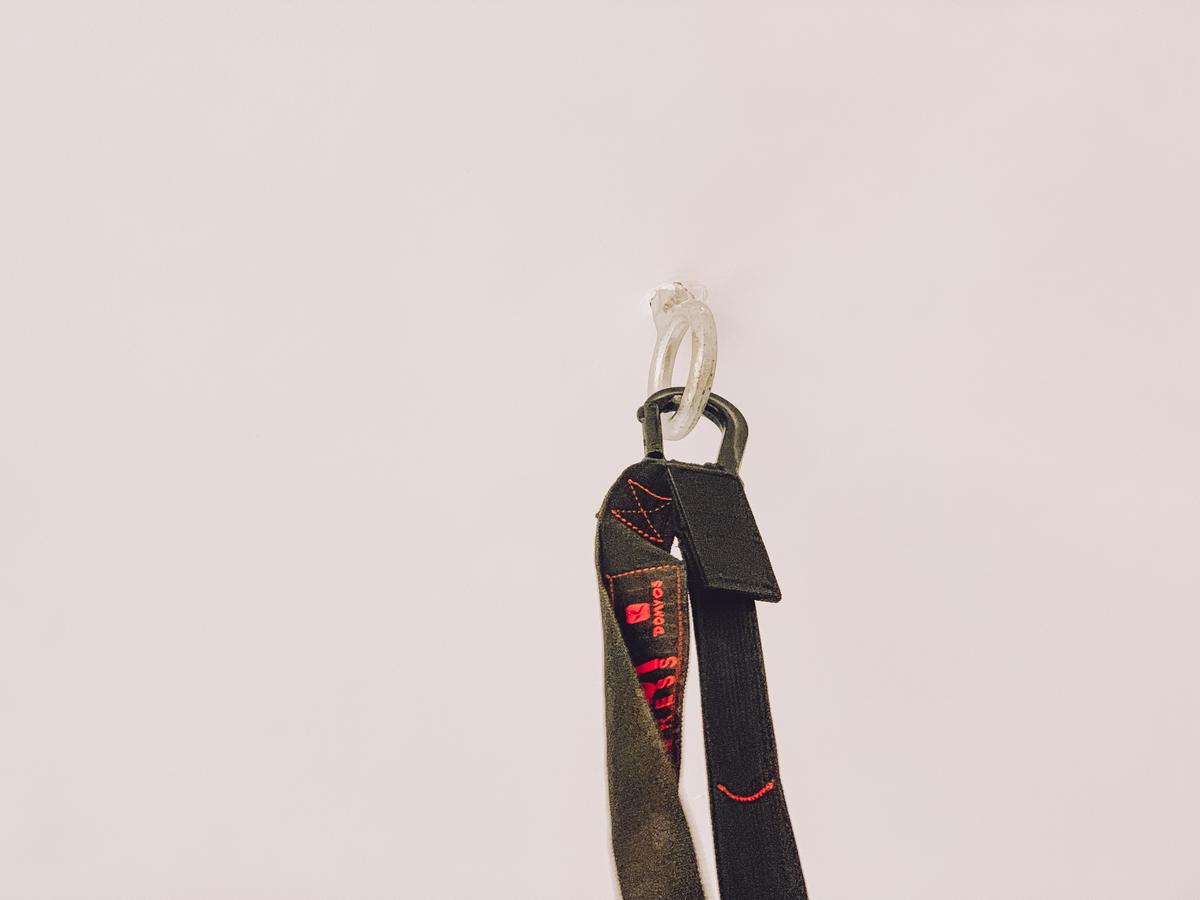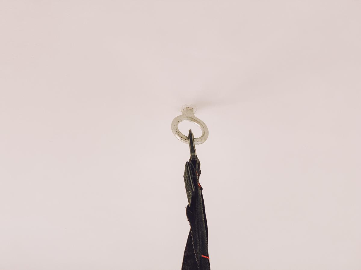 Durante de la reforma de la cocina aprovechamos para abrir el techo y clavar una argolla directamente en la viga con el fin de colgar mi precioso columpio de mimbre que me regalaron para mis 30 cumpleaños. La realidad es que el columpio espera paciente en el trastero el momento de reinar en el salón mientras estas cintas van y vienen con nuestra hija colgando en ellas.