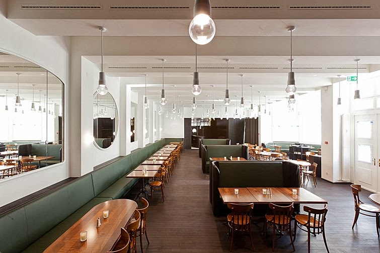 Montón de detalles fantásticos por todas partes como las lámparas con LED junto con difusores de cristal soplado artesanalmente proporcionando una iluminación de techo moderna. El diseño de las sillas están basados ??en el modelo original de la silla Volkshaus, taburetes de madera curvada delante de la barra y suelo con baldosas en forma de abanico.