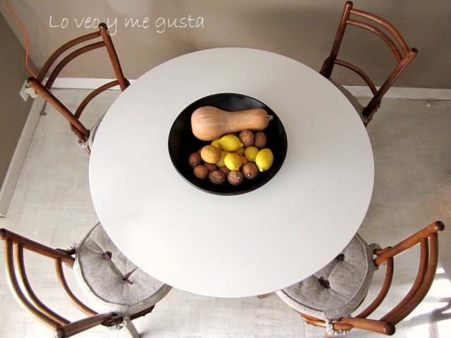 Lo difícil fue la mesa, no acababa de ver una pieza que me encajara con estas sillas, así que al final me decidí por darles un toque de contraste con la mesa docksta de Ikea, hasta que aparezca la mesa de mis sueños.