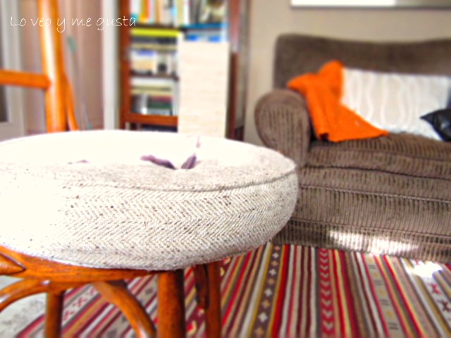Para ello compré genero de espiguilla en una tienda de telas al peso y le encargué a una modista unos cojines redondos con unos lazos marrones que los atraviesan y que me han dado un resultado estupendo.