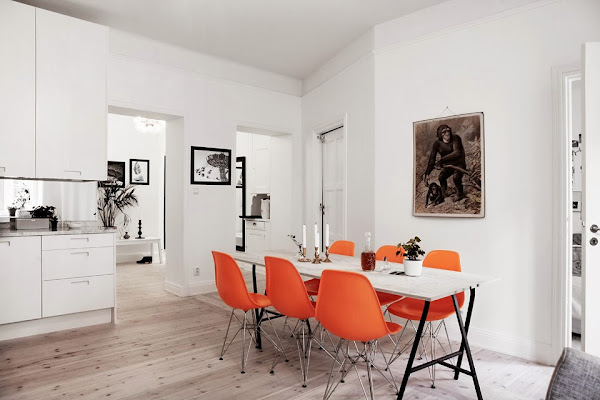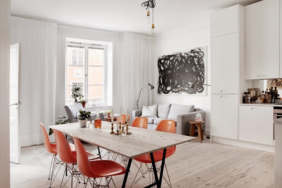 Hoy os traigo un apartamento decorado en tonos neutros en el cual el color naranja cobra protagonismo e ilumina el comedor. Las sillas Eames de color naranja son una apuesta arriesgada pero muy atractiva.