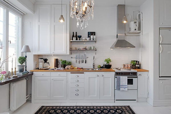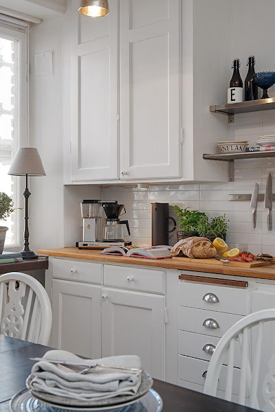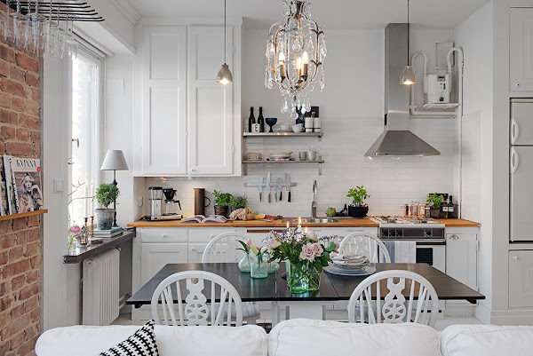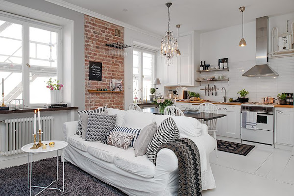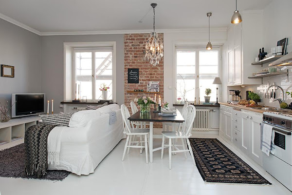 Destaca la pared de ladrillo rústico, que marca la división entre cocina y salón donde además se cambia la gama de color para separar aún más las estancias. Los colores suaves y los muebles blancos proyectan la sensación luz.