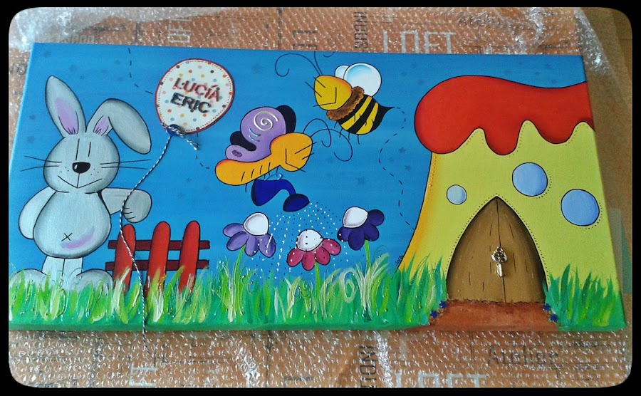 Como la habitación la compartirá con su hermana Lucía, que entonces ya será la hermana mayor, en el globo que sostiene el conejo Yep, no podía faltar el nombre de los dos hermanos.
