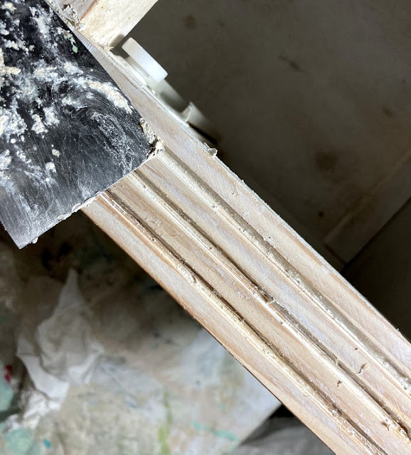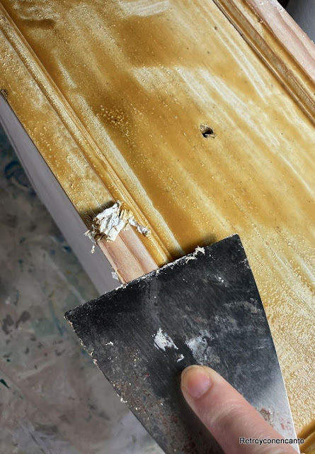 El color blanco tenía que desaparecer por completo, así que, recurrimos al decapante, a la lijadora eléctrica, a la manual, a la espátula...,