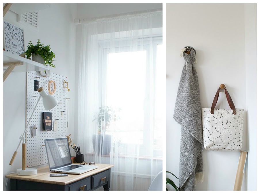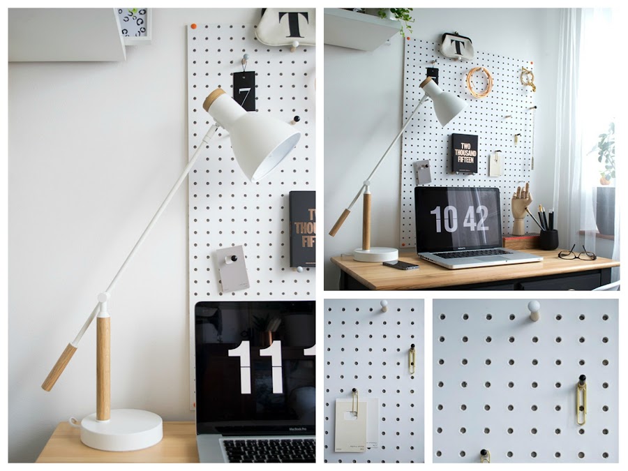 El tablero sobre el escritorio. Segundo elemento DIY que, con su color blanco y la sombra negra de sus agujeros, remarca aún más el contraste entre los dos colores marcado por las paredes y la mesa. Ya sabéis que utilizar un tablero de clavijas, pensado para guardar herramientas, a modo de mood board y espacio de almacenaje al mismo tiempo es uno de mis recursos favoritos para los espacios de trabajo. Sin duda, otro acierto.