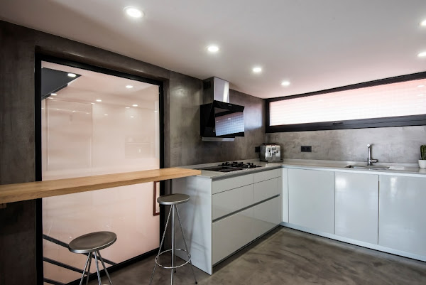 El mobiliario es de la firma española Santos, combinando los modelos LINE-L y PLANO ambos laminados seda mate en color gris nube, sin tirador visible (gola) y encimera Silestone Kensho de 2 cms. de grosor.