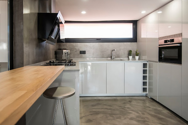 Abierta al salón y comedor, aunque está perfectamente delimitada, cuenta con una cómoda barra de madera de haya para desayunos, enfrente de un panel fijo acristalado que le aporta más visibilidad y luz.