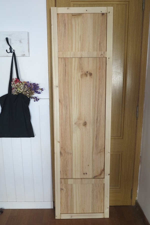 Podéis montar la puerta como más os guste, yo le he hecho una estructura sencilla, de lineas muy rectas. Solo hay que cortar los listones con las medidas que queramos y pegarlos con cola de madera al tablero.