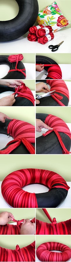 Yo os pongo que para forrar la cámara neumática utilicéis el trapillo , lo digo por que es el material que esta de moda ademas lo encontraréis en muchas tiendas de vuestras ciudades y empieza a ser un material bastante económico . Y si no lo queréis comprar siempre podéis reciclar las camisetas viejas , si no sabéis como hacerlo Clica Aquí y al final del post hay un vídeo donde explica como cortar las camisetas para hacer trapillo.