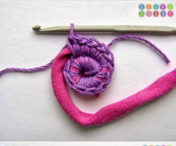 Para empezar hacer un redondel con el trapillo , como veis en la imagen de arriba , no demasiado grande y empezar a tejer ..Los puntos a utilizar son el punto bajo y cadeneta...