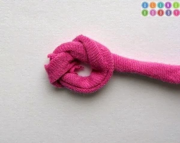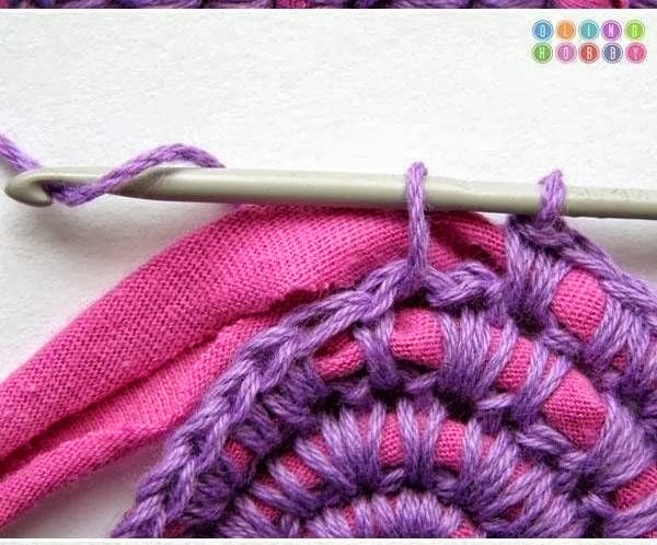 Cuando hayáis dado la vuelta tenéis que unir el final de la vuelta con el principio utilizando un punto bajo, procurar siempre que el trapillo quede en medio del punto , como si estuvierais forrando el trapillo.