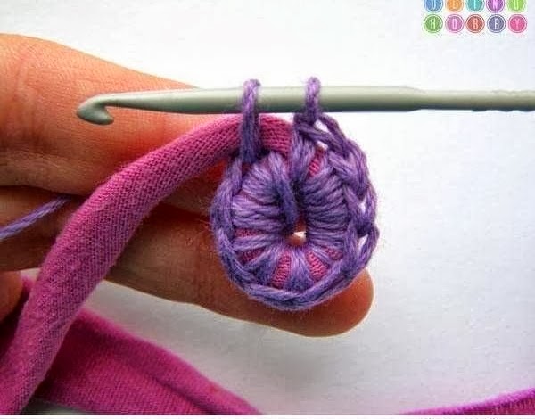 Tenéis que ir tejiendo abrazando el trapillo ( como si fuera el relleno de la alfombra ) con el punto bajo consiguiendo el redondel ..
