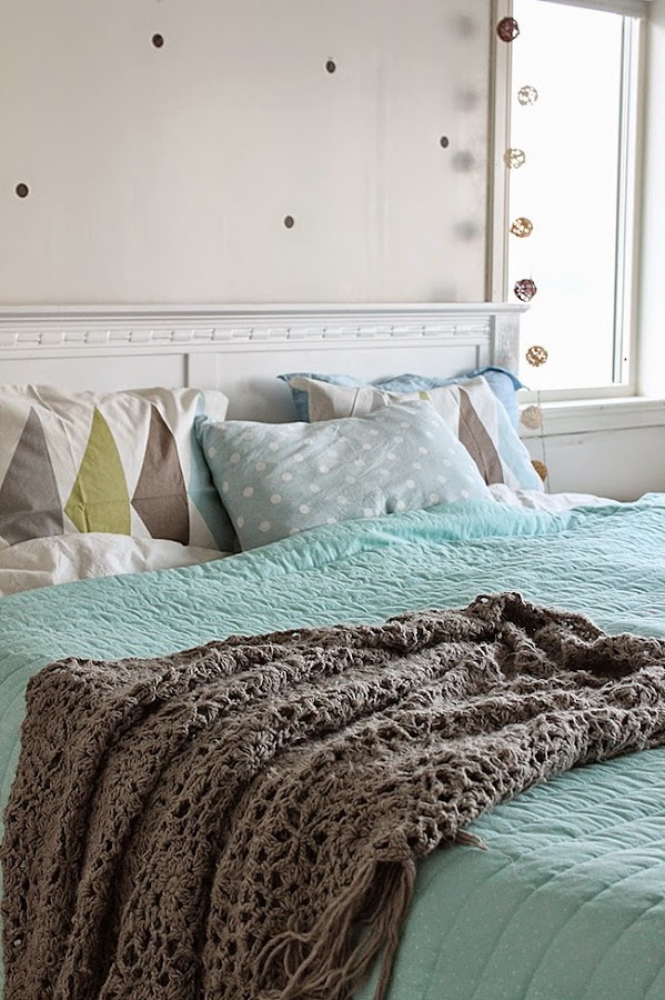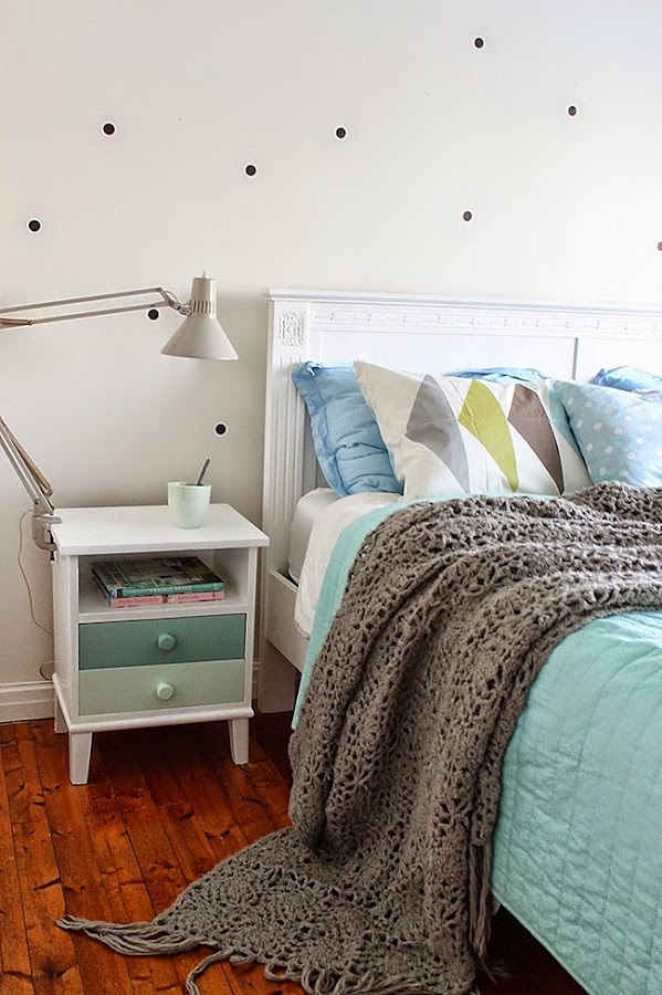 Pero si tenéis dudas os traigo un ejemplo de como el mint y los turquesas pueden ser bien recibidos en otoño ¿la pieza neutra? una simple manta gris y unos vinilos de lunares negros, dos detalles a los que les queda bien todo y que consiguen que el color se integre al 100% en este dormitorio.
