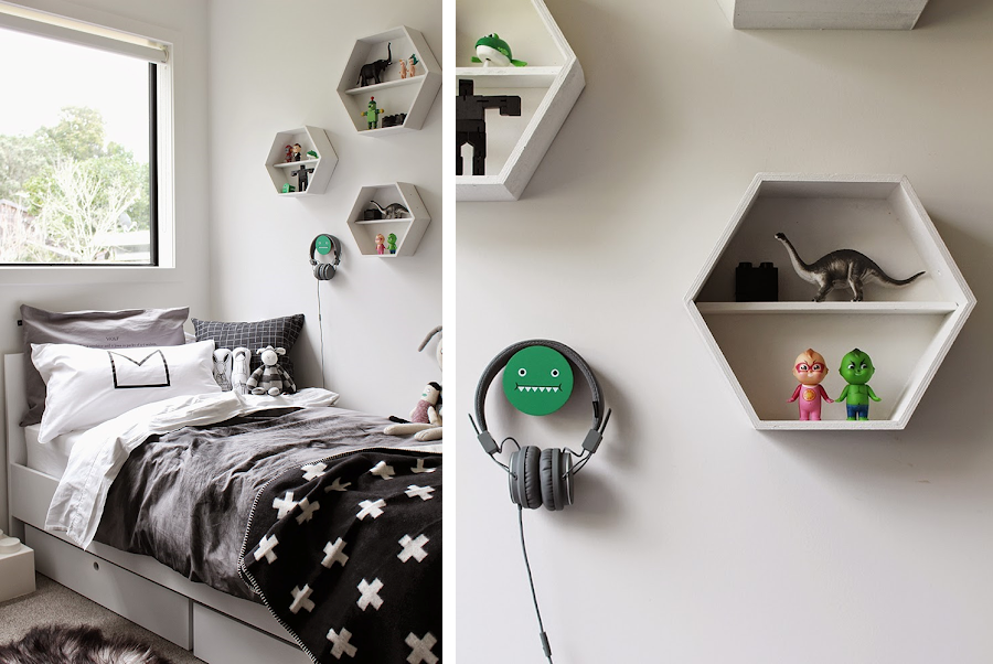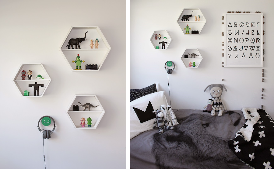 Nos adentramos en un dormitorio infantil estilo nórdico decorado en su totalidad en blanco, negro y gris. La combinación cromática puede parecer un poco fría para un niño, pero esto se compensa con elementos decorativos infantiles que nos devuelven al mundo de los sueños. El mobiliario y textiles de diseño de estilo puramente nórdico se mezcla con muñecos, peluches y grandes piezas de juego de construccion. Guirnaldas de bolas de fieltro en gris, perchas con forma de nube y casilleros exagonales completan la decoración de este moderno dormitorio infantil de estilo nórdico.