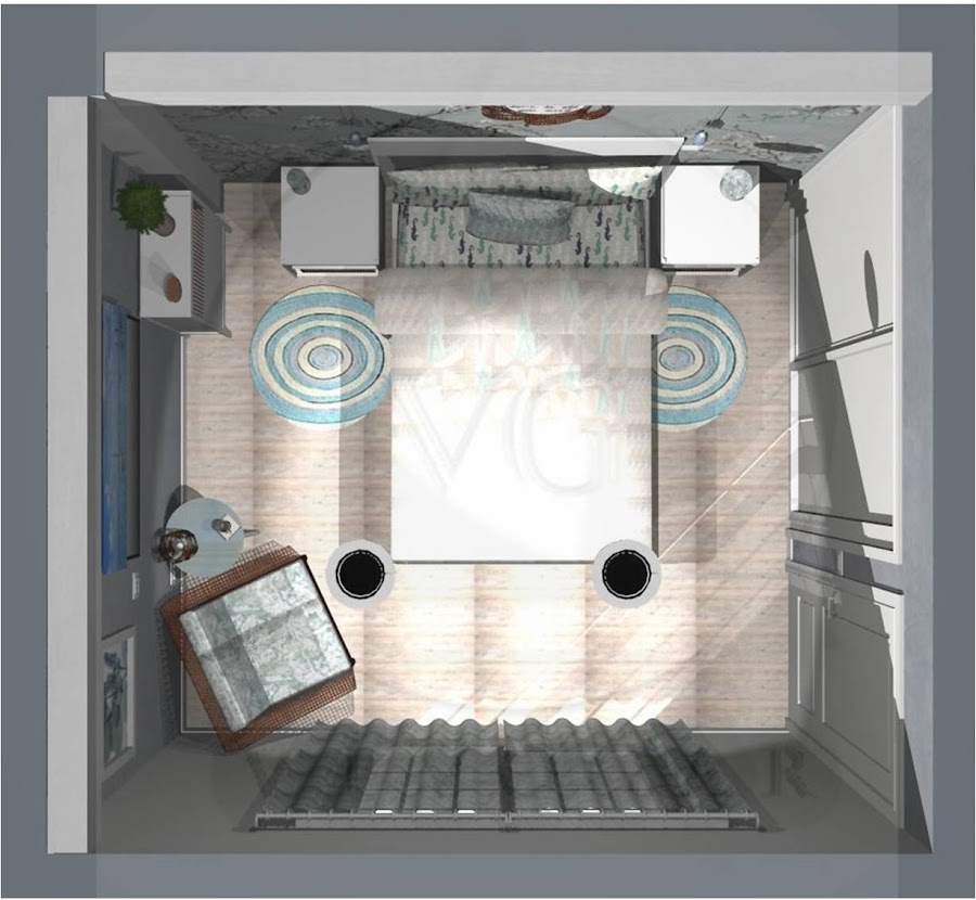 Nos sumergimos en el azul profundo del océano (tono de moda de 2020) para darle vida a una estética clásica renovada: blanco-azul con toques modernos de gris y japandi fusionados en un dormitorio acogedor. Pilar, falsas vigas, friso y cabezal en blanco decapado, mural con estampado japonés, paredes en azul grisáceo con efecto esponjado, muebles blancos y en contraste rejilla oscura para los cajones, el adorno con letras sobre el cabezal, el sillón y la lámpara farol. Textiles estampados en azul, verde turquesa, beige o gris, mezclando geométricos, plantas, caballitos de mar. Lámparas, jarrón y vacía bolsillos en cristal azul ligero y relajante. Aunque una tv. no es lo más recomendable dentro del dormitorio en esta propuesta la ocultamos tras un estor con el mar de fondo.Si instalas falso techo plantea una habitación sin aire acondicionado y opta por un sistema VMC (ventilación mecánica controlada).