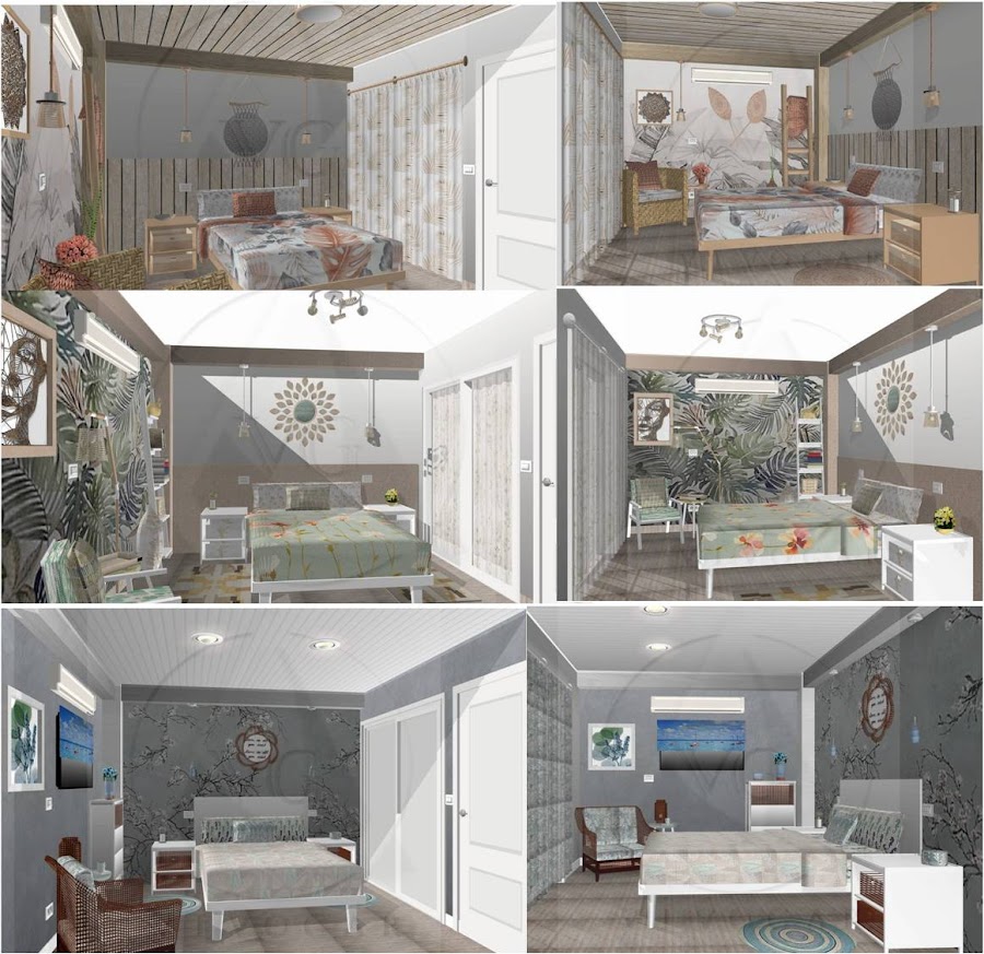 Si hablamos de decoraciones naturales nos vienen a la mente imágenes del campo verde y los jardines llenos de flores multicolores, y ellos han sido nuestra inspiración para esta propuesta fresca y primaveral. Esta vez usaremos corcho para revestir el pilar, el cabezal y las falsas vigas, tb. presente en el marco del cuadro; predominio del blanco en los muebles. Utilizamos madera pintada con estarcidos de flores en los cajones, el adorno sobre el cabezal, el jarrón, la bandeja y el joyero. Los motivos utilizados son las plantas y flores en el papel, las cortinas o los textiles –visillos de la correderas en el interior del armario y en las puertas de la terraza. En cuanto a colores predominio de verdes y toques de amarillo vivo. Finalmente la iluminación en rejilla de madera –bambú o mimbre- para focos y pantallas.Propuesta C