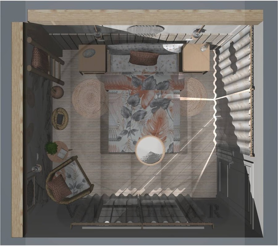 Una decoración rústica natural-tropical. Pilar, vigas falsas, friso del techo y cabezal en madera envejecida. Los muebles y la escalera en madera natural en tono intermedio. Estampado de hojas presentes en el empapelado, las cortinas del armario abierto, de la salida a la terraza y los textiles de la cama. Al disponer de una base neutral en los elementos principales de la habitación aplica cualquier gama cromática, siempre que el fondo sea blanco. En nuestra propuesta nos decantamos por el dúo coral-gris. La clave es la integración de diversos materiales naturales: el corcho del jarrón, la mesita velador o los cables de las lámparas; el sillón y el cesto de junco trenzado, la cuerda de los cajones y las pantallas de las lámparas, así como el yute de los abanicos pay-pay en forma de hojas o las alfombras. Completan la decoración elementos boho como el cuadro mandala o el adorno de macramé sobre el cabezal, dos cojines y una mantita de crochet. Últimos detalles: un farolillo y un vacía bolsillos de piedra natural, este material rugoso “con alma” no carga el espacio si lo aportamos en objetos pequeños.Propuesta B