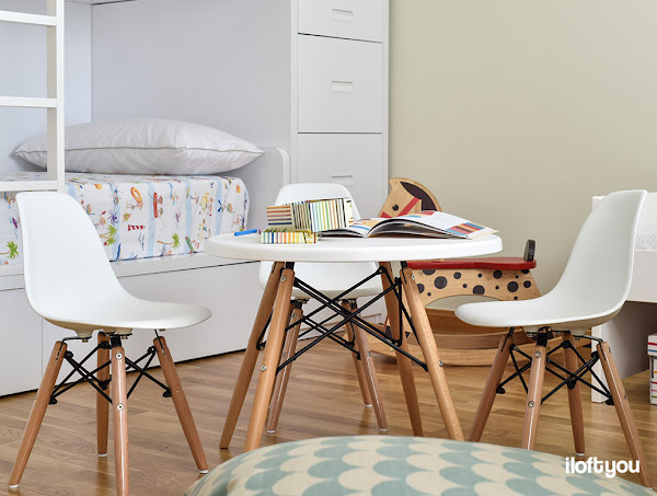 En la habitación final, estas diseñadoras de pro, han conseguido disponer sin problemas, una espaciosa zona de juegos, un armario-vestidor, y una amplia zona de descanso. En la zona central de este dormitorio han seleccionado, con acierto, una mesa Eames, con tres sillas del mismo modelo en versión infantil.