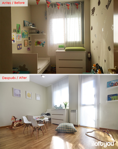 Como ya te he explicado antes, este dormitorio originalmente eran dos habitaciones individuales, así que lo primero que se decidió fue derribar el tabique que las unía para conseguir así un dormitorio mucho más ancho, en el que poder ubicar sin problemas a los tres hermanos.