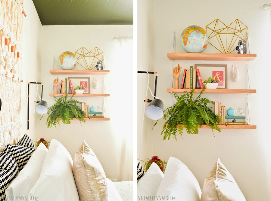 Lo primero que llamó mi atención de este dormitorio chic, con cierto estilo retro, fue su cabecero realizado con un panel de madera, tubos de imitación a cobre y trabajo de macramé.....espectacular. A medida que me fijé en el resto de la estancia no dejo de sorprenderme cada uno de los detalles, la alfombra, las mesillas, la delicada y original zona de tocador con unos fantásticos tiestos colgantes a modo de guirnaldas, la puerta y el techo pintado en verde oscuro............y la iluminación de pared hecha a partir de una lámpara de pie y palos de madera, de la cual al final de post encontrarás un tutorial.