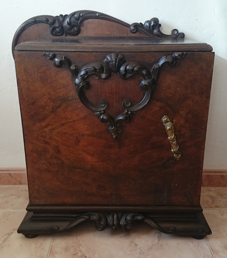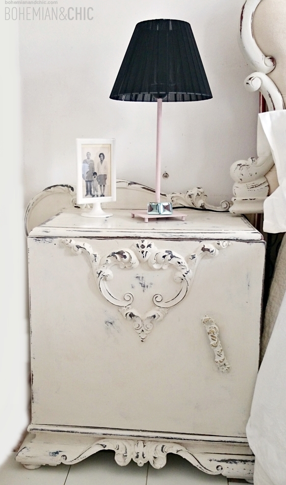 Las mesitas de noche de madera de raiz,siguiendo la misma línea con unas preciosas tallas y un copete de lo más original que recorre la parte alta y uno de los laterales de la mismas.Las restauramos y seguidamente las pintamos con la misma técnica de blanco decapado con pintura Chalk paint y djamos su tirador original que es muy bonito.