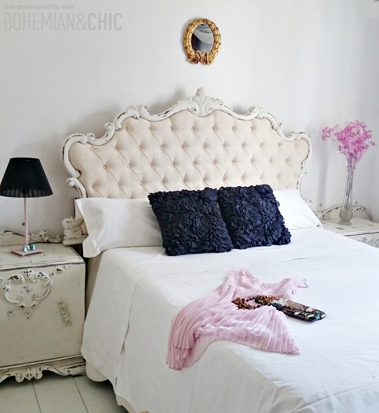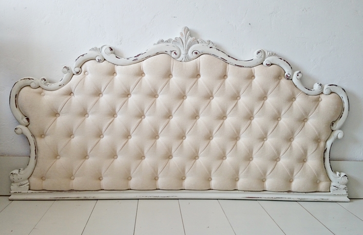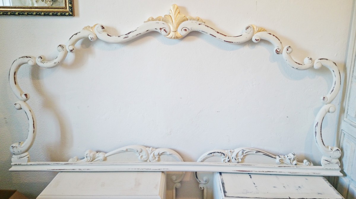 Para el cabecero utilizamos un antiguo marco de un espejo de madera de nogal de lineas curvas y lo transformamos con un acabado en blanco decapado y un detalle en pan de oro en el copete.