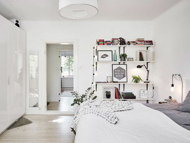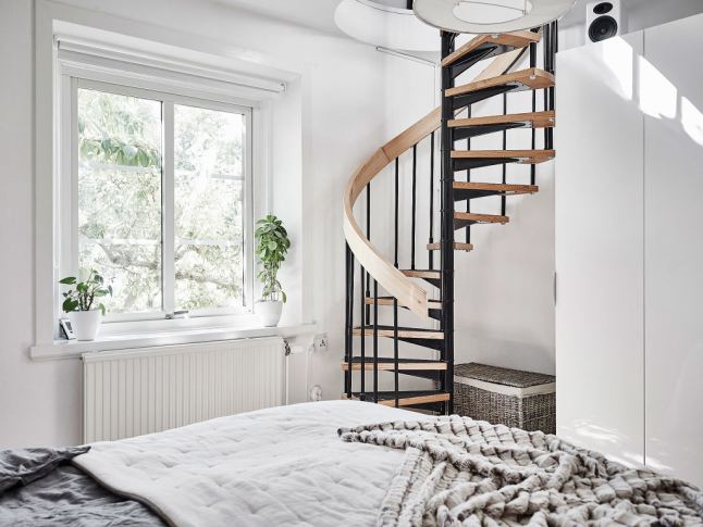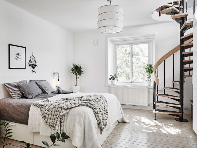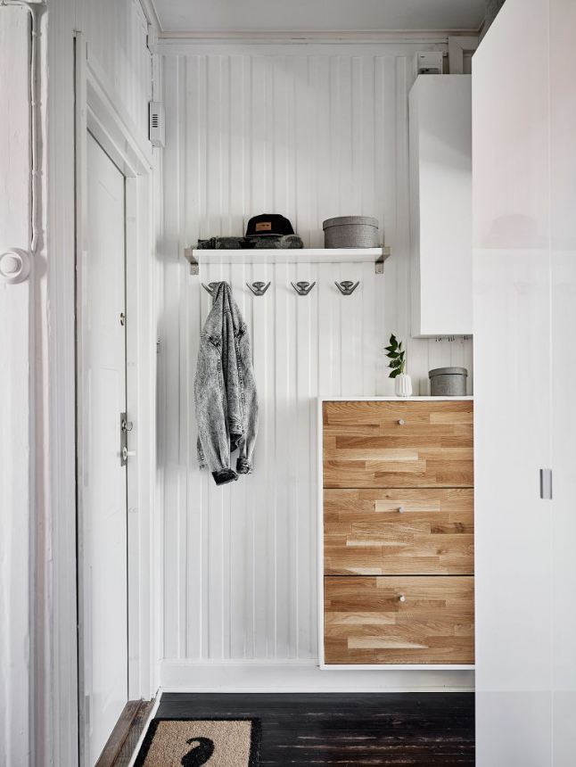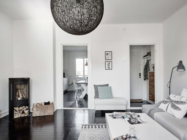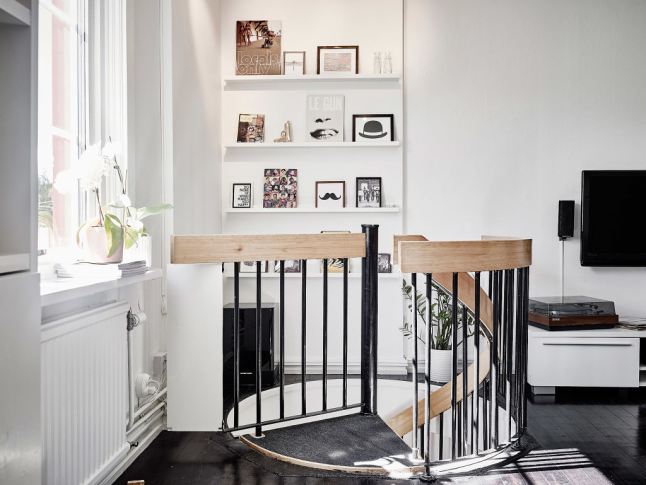 Eso hablando de mobiliario, si además hablamos de como mezclan lo nuevo, lo viejo y lo recuperado ya es otro nivel, este duplex empieza con líneas rectas, vemos cajas de madera que tienen pinta de ser bastante antiguas, la ya más que socorrida GUITARRA ESPAÑOLA (podéis ver el post que le dedique a este detalle aquí) todo en blanco y negro con un mint empolvado como único color.