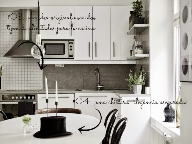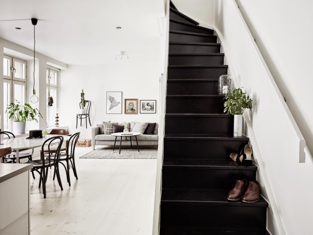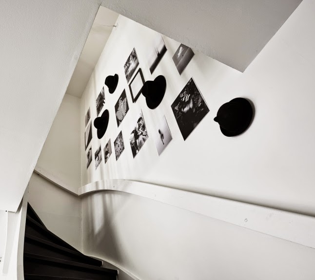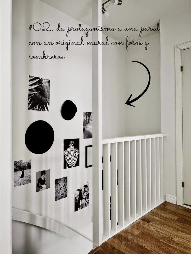 Lejos de ser una zona que podría haber pasado totalmente desapercibida, se le ha dado un gran protagonismo pintando todos los peldaños de la escalera de un intenso negro, y creando en la pared, un armónico mural con fotografías en blanco y negro y con sofisticados sombreros...¡espectacular!