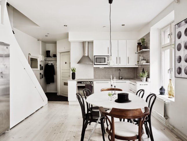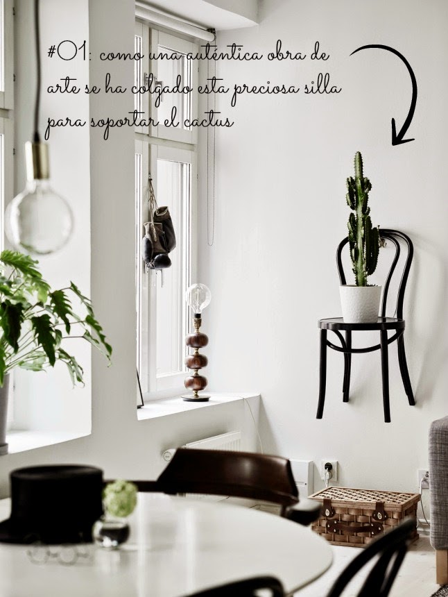 El comedor esta formado por una mesa acompañada de preciosas sillas, que recuerdan a un clásico de los cafés parisinos, como es el modelo Thonet. ¡No me puede gustar más el detalle de la chistera!