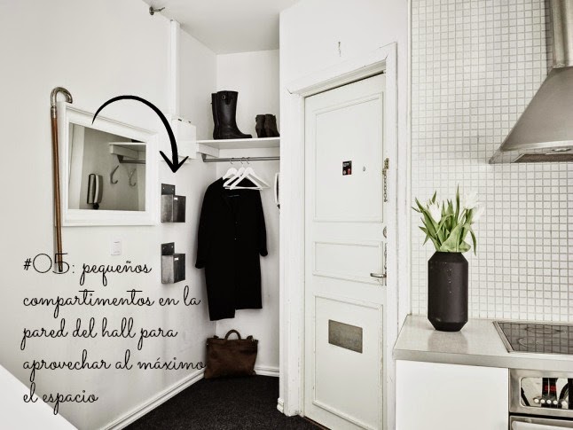 A pesar de no tener una estancia como tal, se ha transformado un pequeño rinconcito de la entrada en un recibidor con todo detalle. Un lugar para zapatos, chaquetas y bolsos y un espejo dónde darse los últimos retoques antes de salir. ¡Vestíbulo mini pero completísimo!